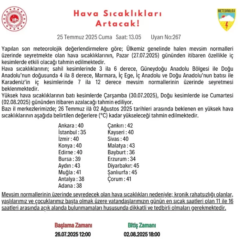Türkiyədə Meteoroloji qurumlardan verilən rəsmi açıqlamaya görə, 27 iyul Bazar günündən etibarən havalar daha da qızışacaq.