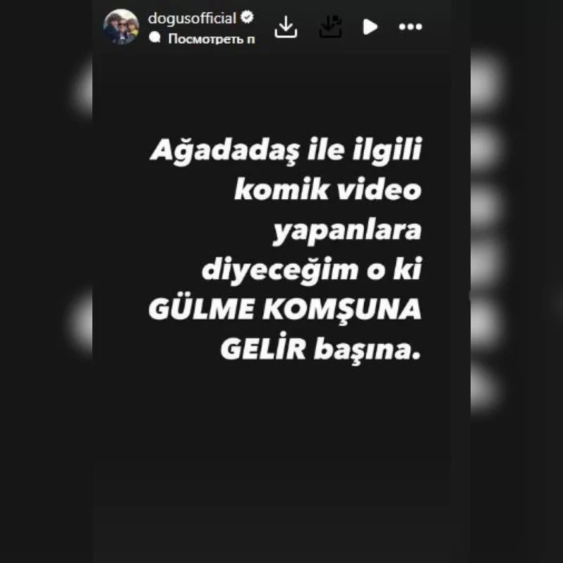 İfaçı bu haqda sosial şəbəkədə yazıb. “ Ağadadaşla bağlı komik video yayanlara demək istəyirəm ki, gülmə qonşuna gələr başına” deyə Doğuş bildirib.